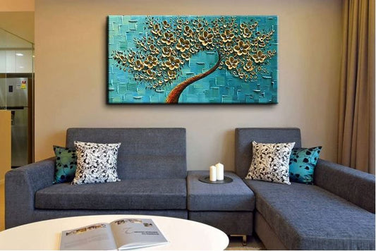 Dipinto ad olio fatto a mano Albero con fiori dorati con sfondo astratto color turchese. Dimensioni 120 x 60cm. PRONTA CONSEGNA.