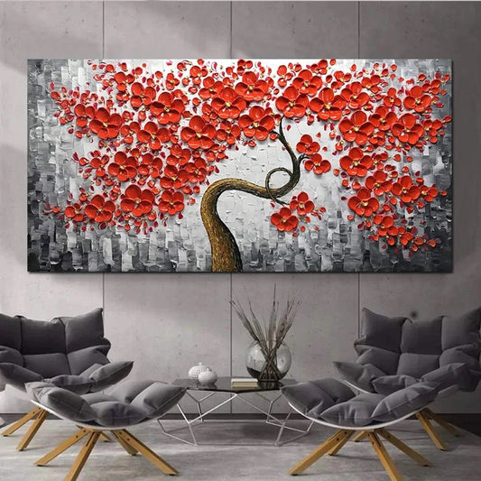 Dipinto ad olio fatto a mano Albero fiorito dai petali rossi su sfondo nero-grigio. DIPINTO SU RICHIESTA.