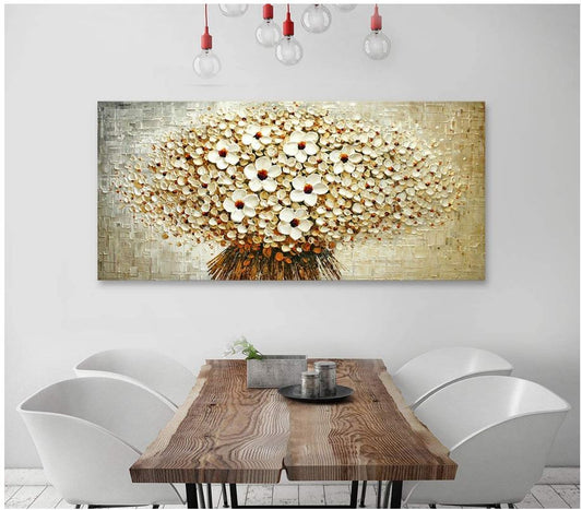 Dipinto ad olio fatto a mano fiori bianchi su fondo astratto. Dimensione 140x70cm in PRONTA CONSEGNA