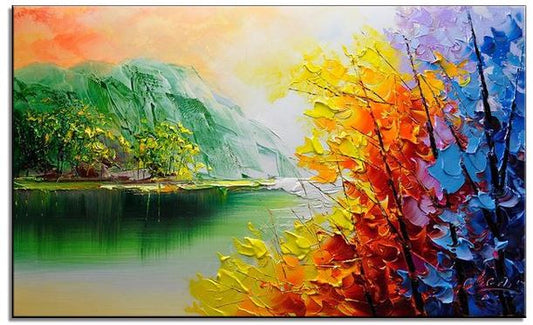 Dipinto ad olio fatto a mano paesaggio lago. Dimensioni 120x80cm. PRONTA CONSEGNA.