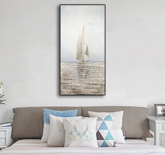 Dipinto ad olio fatto a mano, paesaggio mare barca a vela. Dimensioni 50x100cm. PRONTA CONSEGNA.