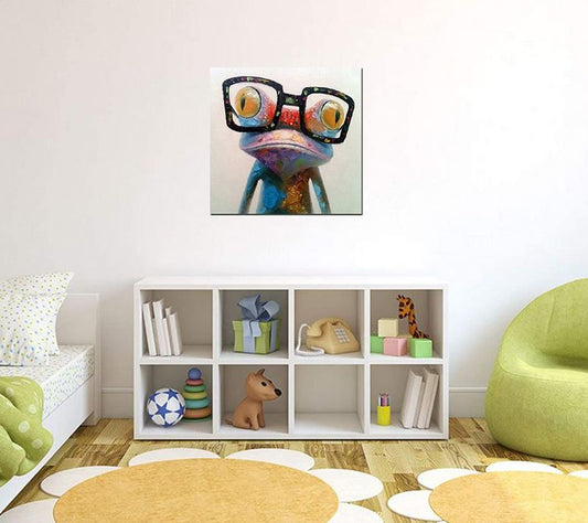 Dipinto ad olio fatto a mano eccentrico divertente rana con occhiali. Dimensioni 60x60cm. PRONTA CONSEGNA.