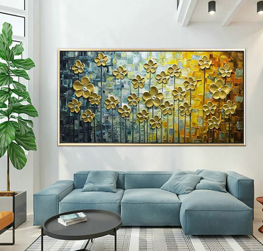 Dipinto ad olio fatto a mano fiori dorati su fondo astratto. Dipinto con tecnica 3D in rilievo. Dimensioni 120x60cm in PRONTA CONSEGNA.