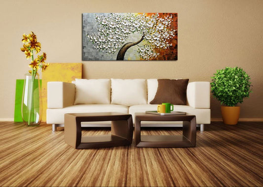 Dipinto ad olio fatto a mano Albero fiorito sfondo astratto. Dipinto con tecnica 3D in rilievo. Dimensioni 60x120cm. DIPINTO SU RICHIESTA