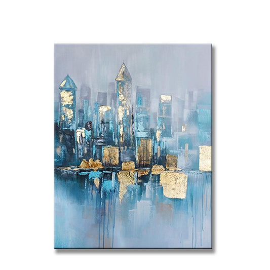 Dipinto ad olio fatto a mano skyline metropolitano con elementi dorati. Varie dimensioni disponibili. DIPINTO SU RICHIESTA.